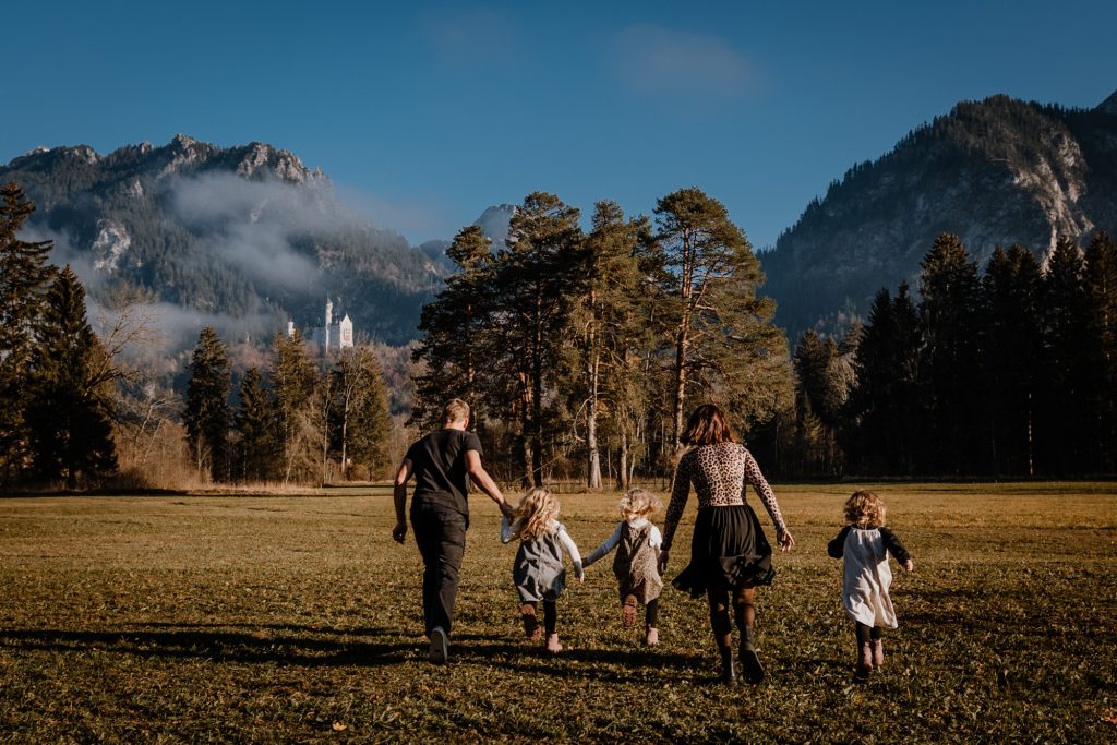 Der Tag begann mit einer einzigartigen Atmosphäre. Sanfter Nebeldunst zog über die Landschaft und tauchte das weltberühmte Schloss Neuschwanstein in eine fast märchenhafte Stimmung. Die kleine Familie stand vor dieser traumhaften Kulisse, während ich die ersten Aufnahmen machte. Es war, als wären wir in einer anderen Welt – ruhig, mystisch und voller Liebe.