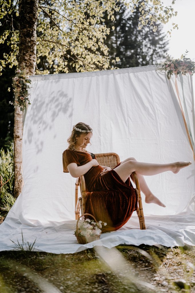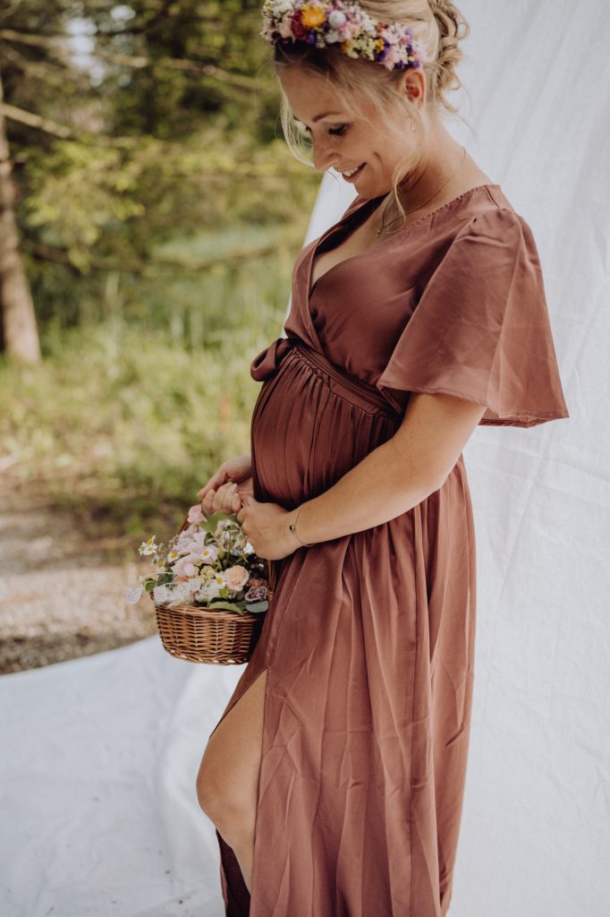 Der Samtstoff reflektiert das Sonnenlicht und lässt dich erstrahlen. Das Oberteil wird gebunden und eignet sich ideal für Stillbilder. Passt einer M mit Babybauch und einer L ohne Babybauch.
